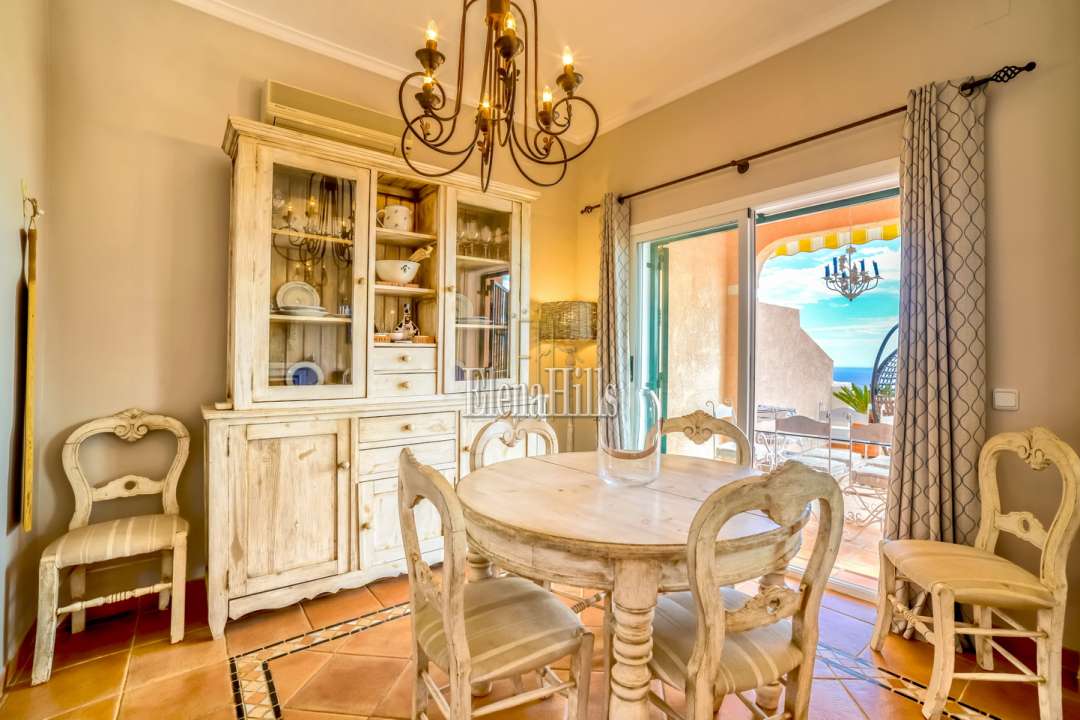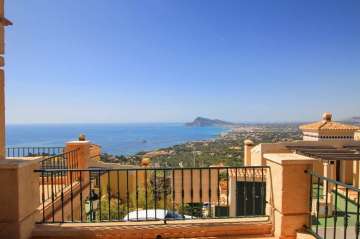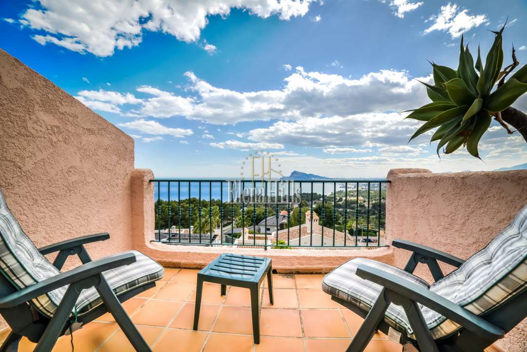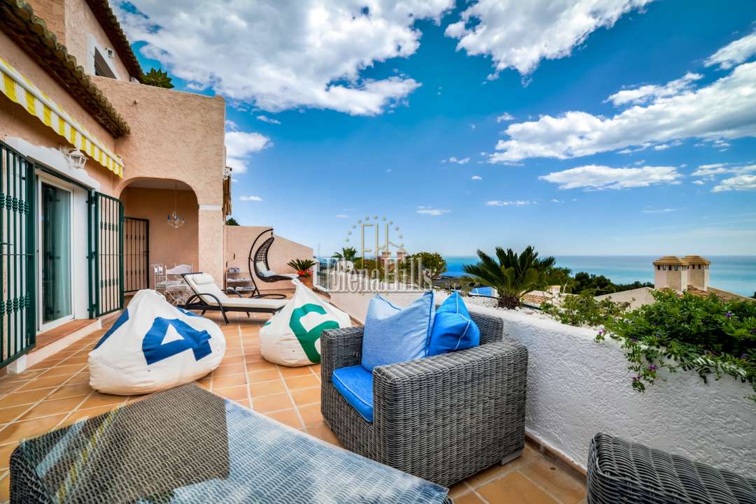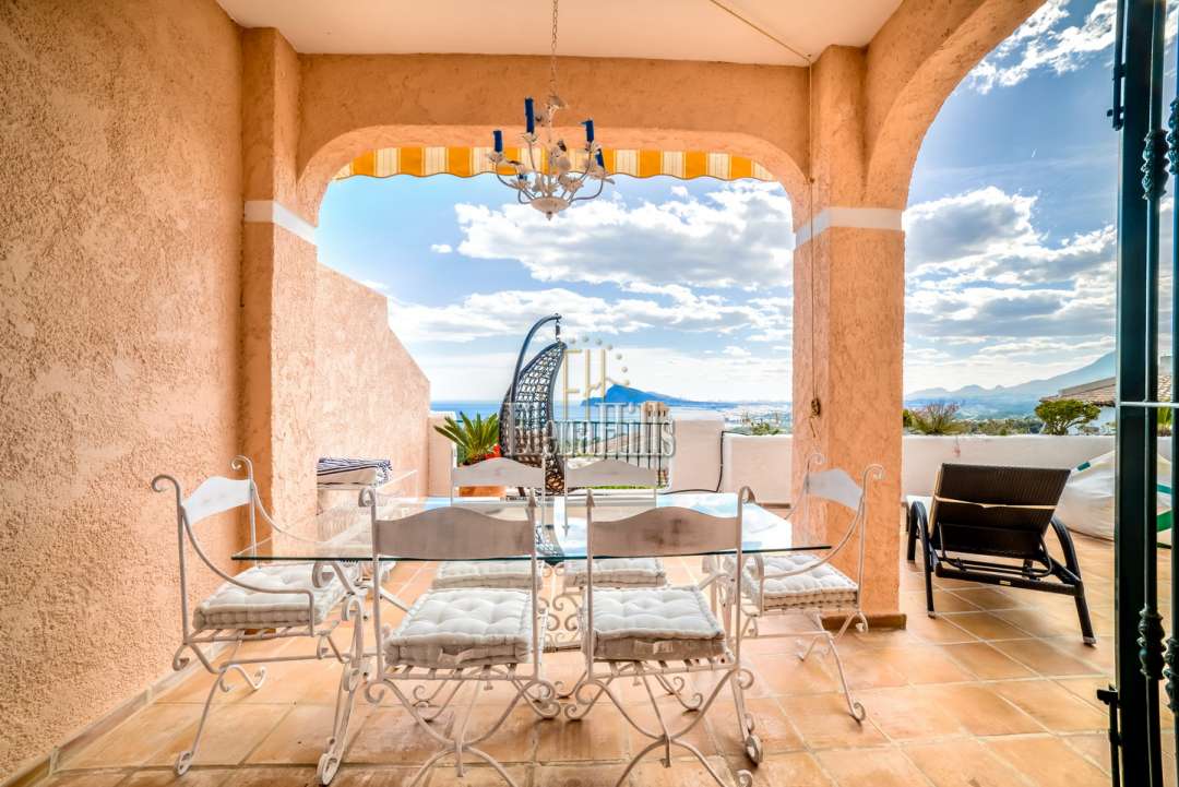 Cozy elegant semi-detached house of 160 m2 for sale - with beautiful panoramic sea views and located in the luxury gated community of Altea Hills (Altea, Alicante). It has been just renovated (2017), it includes 4 bedrooms, 3 bathrooms, 1 guest toilet, a living room of 31 m2, and a fully equipped kitchen of 15 m2 equipped with high end appliances. The living room has direct access to a 106 m2 front terrace with eating and lounge areas, connected to a nicely landscaped back patio with sliding doors to the kitchen. The master bedroom upstairs has bathroom on suite and its own private terrace with breathtaking panoramic sea views of the Bay of Altea and the mountains. There’s a private garage and a guest facility with bedroom and bathroom with separate entrance. This house has an overall feel of comfort and tranquility. An ideal place to spend holidays or to live in an excellent climate of Costa Blanca all year round.