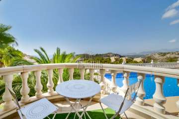 Due to its simple clean architecture, the general feel of this property is that of peace, comfort and tranquility. Recently renovated, the house measures about 179 m2 distributed on two levels with a total of 5 bedrooms and 3 bathrooms. Two of the bedrooms sharing a bathroom are located apart from the main part of the house, right in front of the pool, and can make a perfect guest accommodation. The main house area includes a spacious living-dining room combined with a fully equipped kitchen with island, 3 more bedrooms and 2 bathrooms. From the terraces you can walk out to a large 5 x 10 swimming pool with incredible panoramic views.
